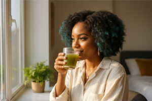 If you’re wondering what the benefits of moringa powder are: it’s a nutrient dense green that can support steady energy, skin glow, digestion, and everyday wellness without caffeine. Think plant protein, iron, and antioxidants in one easy scoop. I use it like this: swirl into water, sip slow, feel grounded.